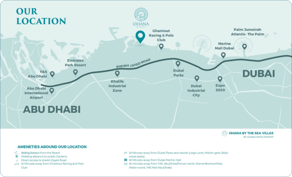 Ohana by The Sea is located in Ghantoot Area. Obtaining a property in this premium neighbourhood alongside the coastline of Sahel Al Emarat in Ghantoot is a dream for both locals and foreigners wishing to be close to the history and nature of the UAE. Residents of the community can easily get to Dubai and Abu Dhabi via the E11 road, where Dubai is located within a 30-minute drive, while travel time to the Emirati capital takes about 45 minutes.